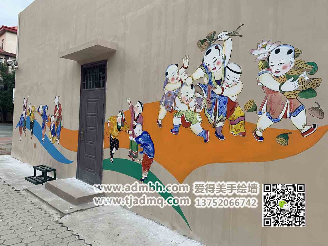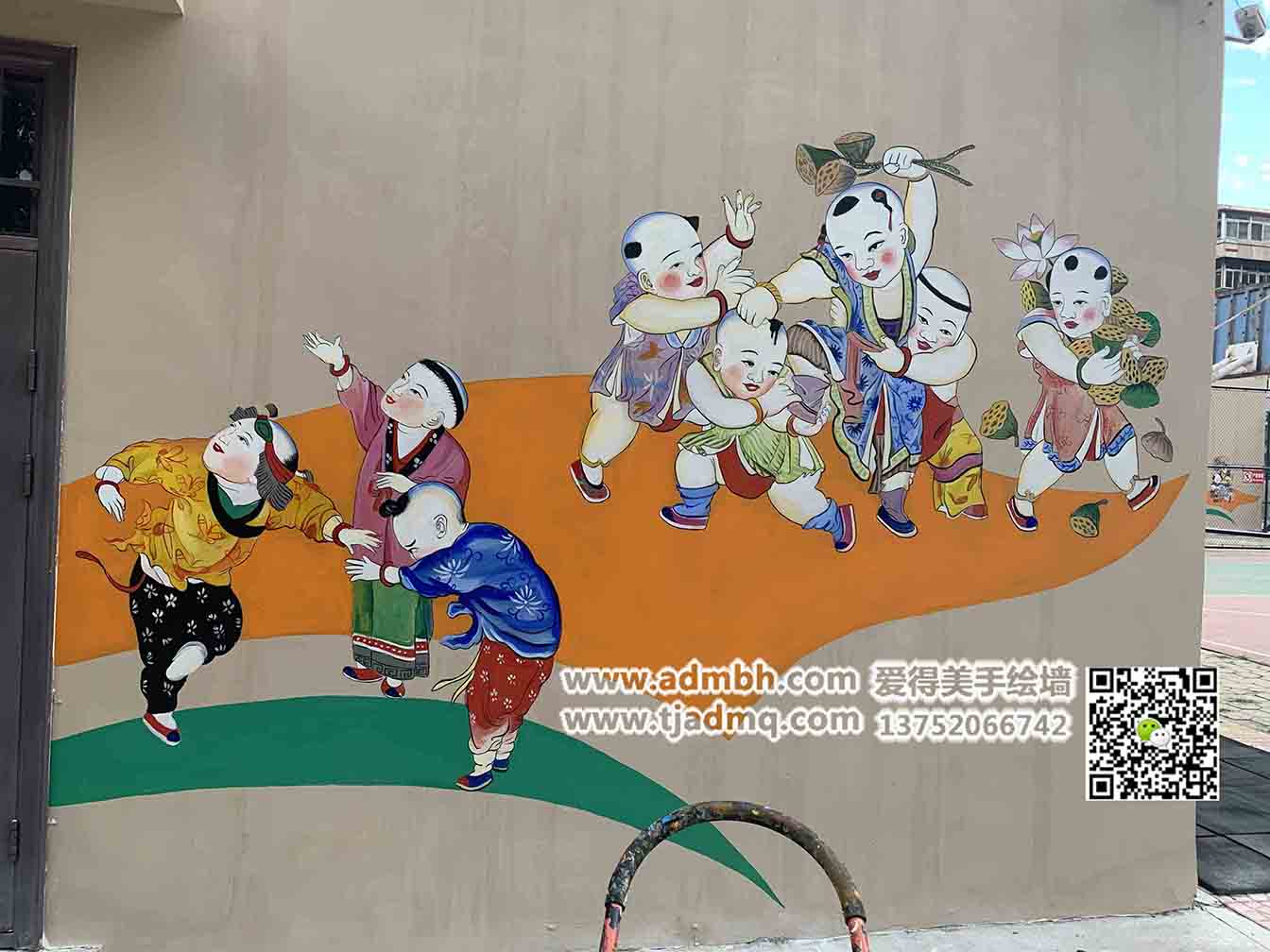 為天津市北辰區(qū)引河里小學(xué)畫的墻體彩繪!客戶要求再操場(chǎng)畫楊柳青年畫風(fēng)格小孩玩耍的場(chǎng)景畫面,所以根據(jù)現(xiàn)場(chǎng)墻面條件,設(shè)計(jì)了一款墻繪效果圖,符合現(xiàn)場(chǎng)墻繪造型位置感覺(jué),看起來(lái)舒服,畫后也得到校長(zhǎng)好評(píng)。