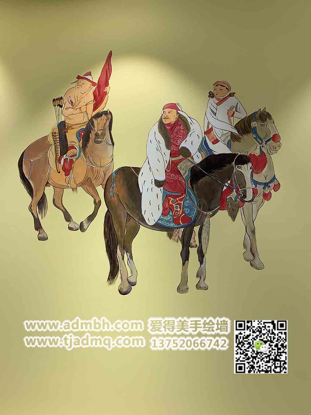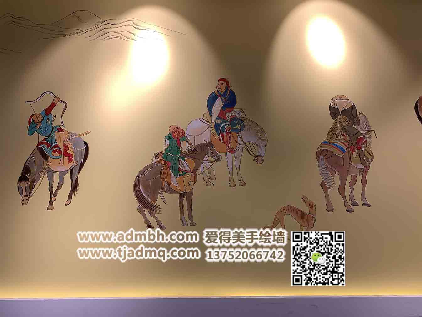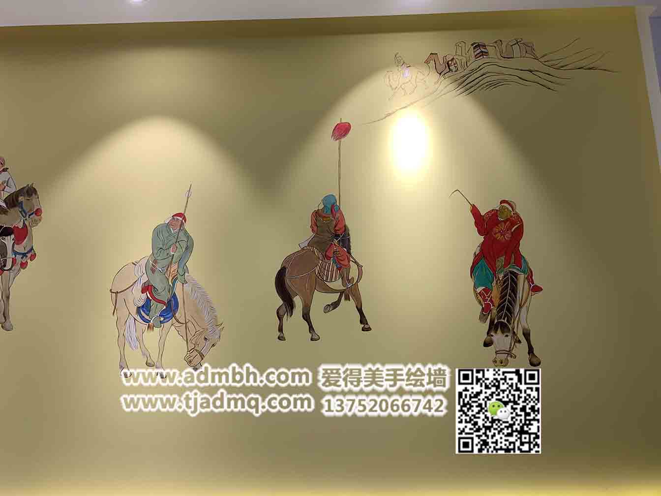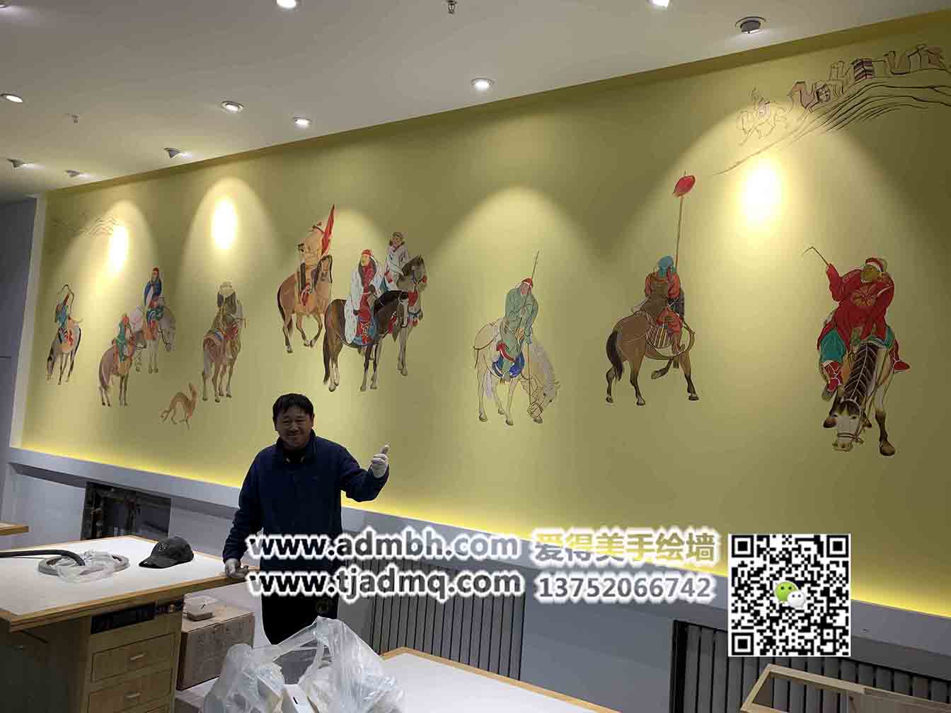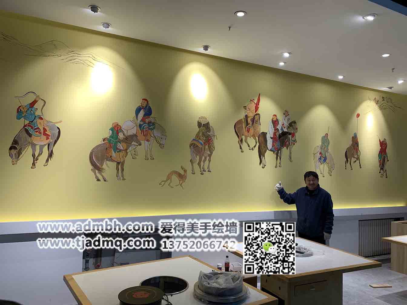為天津市武清區(qū)萬達廣場小肥羊火鍋餐廳畫的手繪墻繪,畫后老板很滿意,斑駁的古代壁畫效果,線條勾勒出了畫面人物的造型。